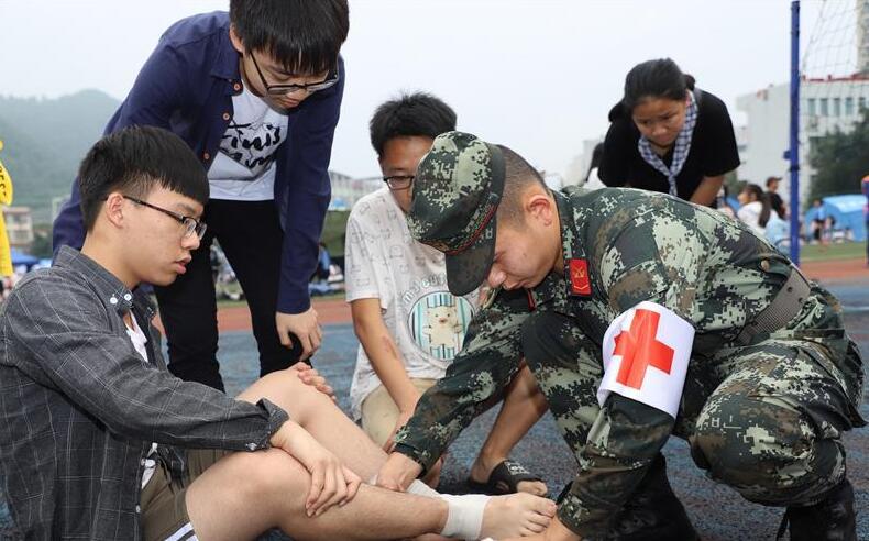 6月18日,在宜宾市珙县第一中学,武警四川省总队乐山支队卫生队给受伤的中学生包扎。新华社发(何伟俊 摄)