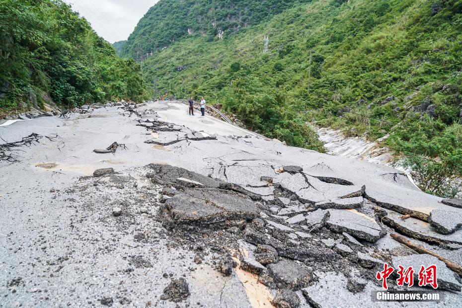 6月16日21时至17日凌晨5时,广西凌云县出现强降雨引发山洪,导致212国道2255公里处发生道路塌方,12名人员失联。中新社记者 陈冠言 摄