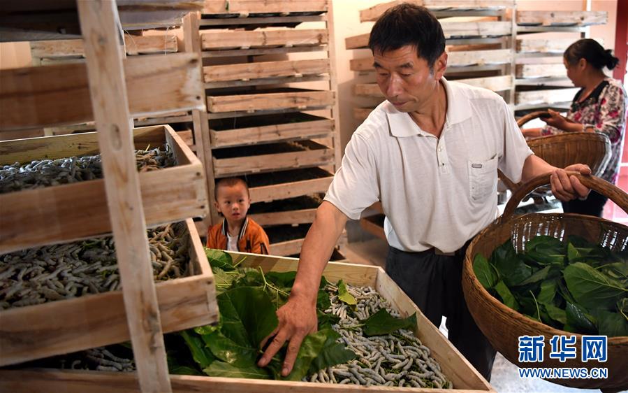 6月20日,连河村党支部副书记、兴旺蚕桑合作社理事长雷利峰(前)在家喂蚕。雷利峰带头学技术做示范,带领乡亲养蚕致富。秦岭深处的陕西省洛南县四皓街道办连河村党支部吸纳28户贫困户成立兴旺蚕桑合作社,走“基地+合作社+贫困户”和“政策调动、科技推动、大户带动”的路子,带领蚕农脱贫增收。2018年28户贫困户通过养蚕户均增收6428元,成效显著。新华社记者 陶明 摄