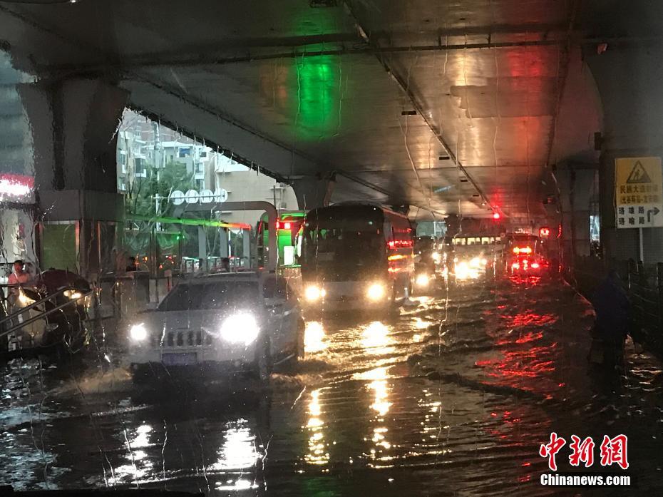 6月21日7时06分,武汉市气象台发布发布暴雨橙色预警信号,至今晨6时武汉累计降水量达124.6毫米。目前,市内积水严重,早高峰交通状况受到不同程度影响。图为路上积水严重,早高峰受到影响。 裴春梅 摄