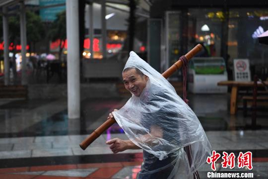图为重庆街头的力哥利用塑料袋自制雨衣遮雨。 陈超 摄