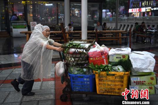 6月22日,重庆街头的力哥利用塑料袋自制雨衣遮雨。当日,重庆市气象台发布“暴雨黄色预警信号”,预计重庆市西部、中部偏南和东南部地区将出现50mm以上强降水,降雨时部分地区伴有短时强降水、雷电,局地大风等强对流天气。