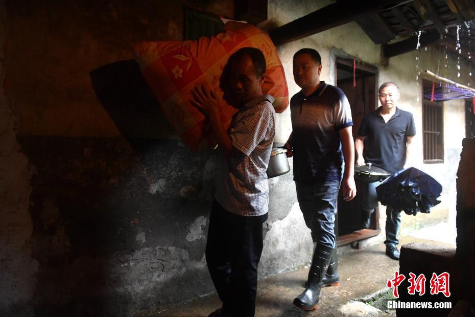6月24日,福建省龙岩市新罗区铁山镇党委书记张永湘(左二)与村干部一起协助受灾民众做好转移工作。受新一轮强降雨持续影响,福建多地受灾。福建省防汛办当日披露,截至当天上午,福建已转移民众逾3.5万人。 中新社记者 吕明 摄