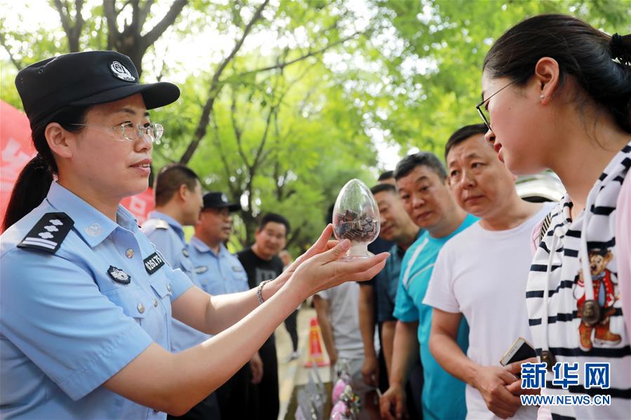 6月24日,在安徽省淮北市庆相桥社区,民警向居民展示仿真毒品样本。 在6月26日国际禁毒日即将到来之际,各地开展形式多样的禁毒主题教育活动,让人们认识毒品危害、远离毒品。 新华社发(万善朝 摄)