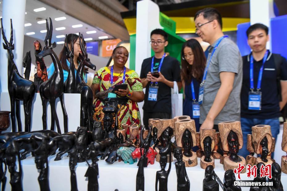 6月27日,各种造型的非洲手工艺品吸引参观者驻足。当日,第一届中国-非洲经贸博览会在湖南省长沙市举行。 中新社记者 杨华峰 摄