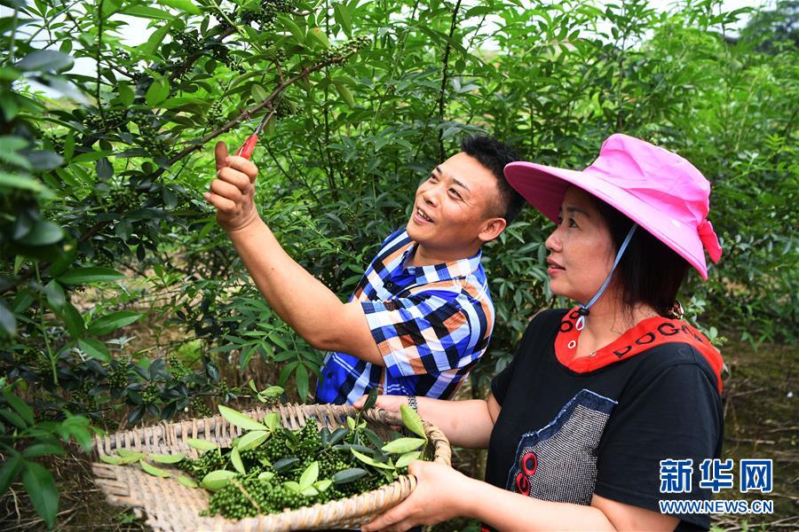 6月27日,刘毅和妻子卢开在位于南川区南平镇玉龙村的花椒种植基地内采收花椒。 1975年,刘毅出生在重庆市南川区西城街道永合社区一个农村家庭。9岁时,他意外被高压电击中,从此失去了右肢。1994年,刘毅从技工学校毕业,干过餐馆洗碗工、当过水果商贩,当过煤炭工人。2010年,刘毅回到农村老家,开始思索创业之路。2011年,刘毅动员村民一起利用荒山种植竹笋,同时发展林下土鸡养殖,初步尝到了生态农业的甜头。 2016年,刘毅开始对花椒种植产生了兴趣。他一边学习钻研花椒种植技术,一边考察适合种植花椒的地方。2018年,在经过小规模的试种以后,刘毅从南川区南平镇玉龙村、景秀村流转了2000余亩荒地,开荒种植青花椒。功夫不负有心人,凭着一股韧劲,刘毅目前已开荒近1500亩,种植花椒树约15万棵,还带动了当地不少残疾人和贫困户就业、脱贫。“我种花椒树是为了实现两个梦想,一个是绿色梦,一个是致富梦。”刘毅说,“在我的成长中,始终感受到亲人、朋友和社会的关爱,我希望通过自己的努力,好好回报大家、回报社会。” 2019年5月,刘毅被授予“全国自强模范”。 新华社记者王全超摄