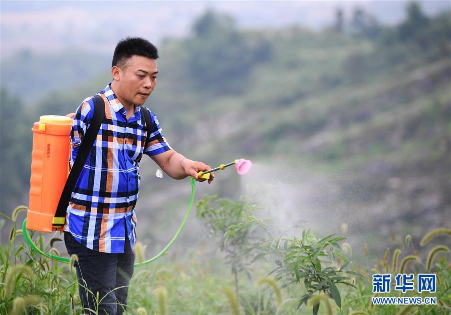 6月27日,刘毅在位于南川区南平镇玉龙村的花椒种植基地内作业。 1975年,刘毅出生在重庆市南川区西城街道永合社区一个农村家庭。9岁时,他意外被高压电击中,从此失去了右肢。1994年,刘毅从技工学校毕业,干过餐馆洗碗工、当过水果商贩,当过煤炭工人。2010年,刘毅回到农村老家,开始思索创业之路。2011年,刘毅动员村民一起利用荒山种植竹笋,同时发展林下土鸡养殖,初步尝到了生态农业的甜头。 2016年,刘毅开始对花椒种植产生了兴趣。他一边学习钻研花椒种植技术,一边考察适合种植花椒的地方。2018年,在经过小规模的试种以后,刘毅从南川区南平镇玉龙村、景秀村流转了2000余亩荒地,开荒种植青花椒。功夫不负有心人,凭着一股韧劲,刘毅目前已开荒近1500亩,种植花椒树约15万棵,还带动了当地不少残疾人和贫困户就业、脱贫。“我种花椒树是为了实现两个梦想,一个是绿色梦,一个是致富梦。”刘毅说,“在我的成长中,始终感受到亲人、朋友和社会的关爱,我希望通过自己的努力,好好回报大家、回报社会。” 2019年5月,刘毅被授予“全国自强模范”。 新华社记者王全超摄