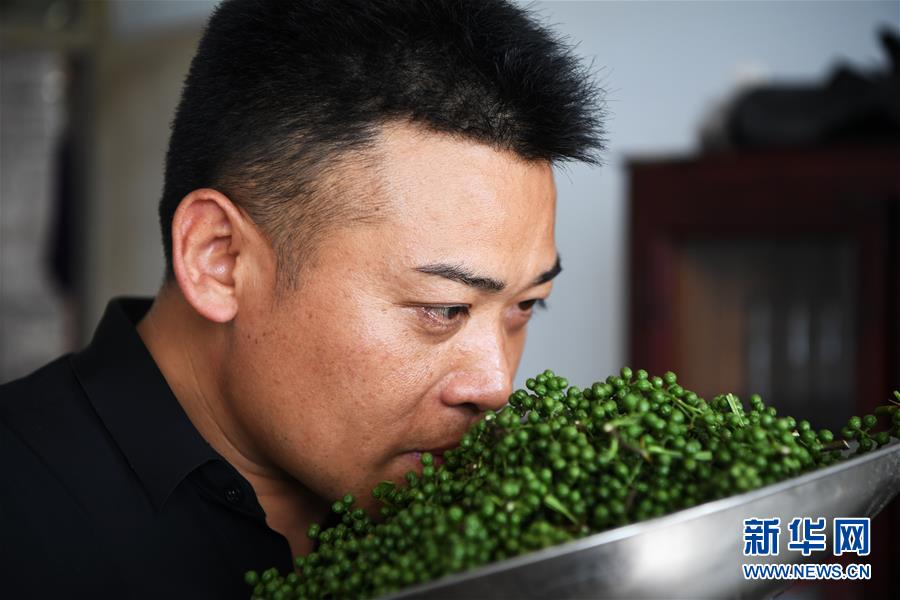 6月27日,刘毅在闻刚采收回来的花椒香味。 1975年,刘毅出生在重庆市南川区西城街道永合社区一个农村家庭。9岁时,他意外被高压电击中,从此失去了右肢。1994年,刘毅从技工学校毕业,干过餐馆洗碗工、当过水果商贩,当过煤炭工人。2010年,刘毅回到农村老家,开始思索创业之路。2011年,刘毅动员村民一起利用荒山种植竹笋,同时发展林下土鸡养殖,初步尝到了生态农业的甜头。 2016年,刘毅开始对花椒种植产生了兴趣。他一边学习钻研花椒种植技术,一边考察适合种植花椒的地方。2018年,在经过小规模的试种以后,刘毅从南川区南平镇玉龙村、景秀村流转了2000余亩荒地,开荒种植青花椒。功夫不负有心人,凭着一股韧劲,刘毅目前已开荒近1500亩,种植花椒树约15万棵,还带动了当地不少残疾人和贫困户就业、脱贫。“我种花椒树是为了实现两个梦想,一个是绿色梦,一个是致富梦。”刘毅说,“在我的成长中,始终感受到亲人、朋友和社会的关爱,我希望通过自己的努力,好好回报大家、回报社会。” 2019年5月,刘毅被授予“全国自强模范”。 新华社记者王全超摄