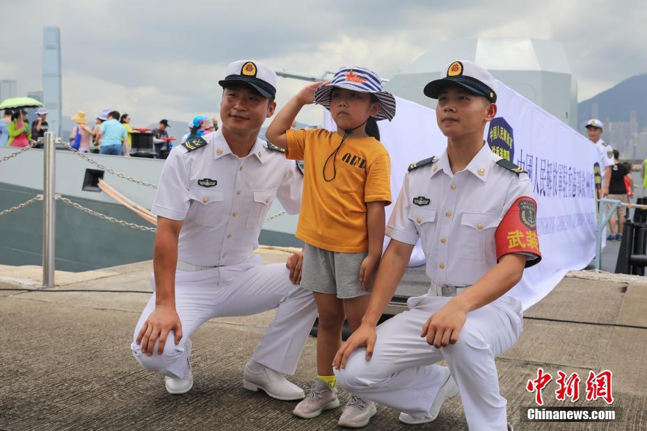 6月30日,解放军驻港部队昂船洲军营举行开放日活动,活动持续2天,共吸引约3万名市民和青年学生入营参观,近距离感受军队、军营和军人所独有的文化和魅力。图为香港小朋友与驻港部队官兵拍照合影。 中新社记者 谢光磊 摄