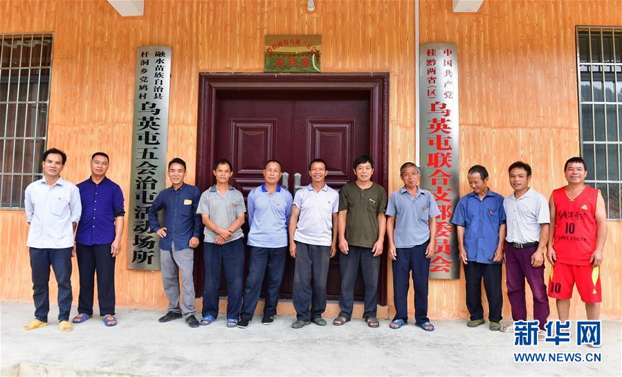 在乌英苗寨联合党支部办公室外,党员和村民合影(6月30日摄)。 乌英苗寨位于黔桂交界的大苗山深处,共有140户600多人。其中100户属广西柳州市融水苗族自治县杆洞乡党鸠村,40户属贵州省从江县翠里瑶族壮族乡南岑村。由于地处偏远,山多地少,脱贫攻坚任务艰巨,目前整个苗寨还有59户贫困户。 面对经济发展落后、贫困面广且程度深的现状,为加强基层党组织的领导核心作用,2017年6月,广西融水苗族自治县杆洞乡党委和贵州省从江县翠里瑶族壮族乡党委针对乌英“一寨跨两省区”的特点,积极探索党建新模式,组建成立“中国共产党桂黔两省(区)乌英屯联合支部委员会”。目前,联合党支部共有党员13名,其中广西籍9名,贵州籍4名。 乌英苗寨联合党支部的建立,使基层党组织的作用突破了行政区域的局限。改善基础设施和环境卫生、成立水果种植合作社、探索发展旅游产业、调解邻里纠纷、组织文体活动……两年来,联合党支部在乌英苗寨的各项工作中积极发挥引领作用,带领群众稳步走在脱贫致富的道路上。 新华社记者 黄孝邦 摄