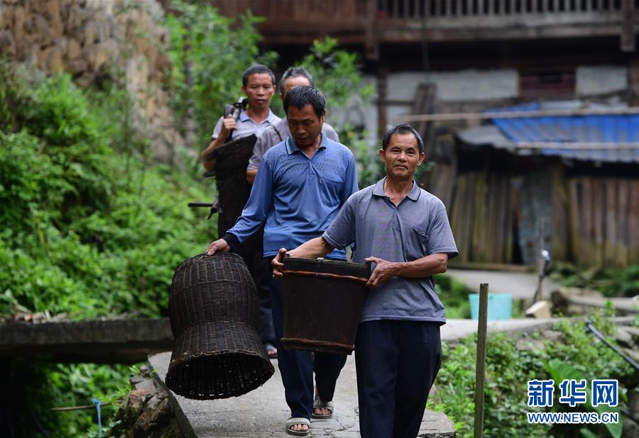 在乌英苗寨,几名党员在搬运老旧的农耕用具,准备用于打造农耕文化一条街(6月21日摄)。 乌英苗寨位于黔桂交界的大苗山深处,共有140户600多人。其中100户属广西柳州市融水苗族自治县杆洞乡党鸠村,40户属贵州省从江县翠里瑶族壮族乡南岑村。由于地处偏远,山多地少,脱贫攻坚任务艰巨,目前整个苗寨还有59户贫困户。 面对经济发展落后、贫困面广且程度深的现状,为加强基层党组织的领导核心作用,2017年6月,广西融水苗族自治县杆洞乡党委和贵州省从江县翠里瑶族壮族乡党委针对乌英“一寨跨两省区”的特点,积极探索党建新模式,组建成立“中国共产党桂黔两省(区)乌英屯联合支部委员会”。目前,联合党支部共有党员13名,其中广西籍9名,贵州籍4名。 乌英苗寨联合党支部的建立,使基层党组织的作用突破了行政区域的局限。改善基础设施和环境卫生、成立水果种植合作社、探索发展旅游产业、调解邻里纠纷、组织文体活动……两年来,联合党支部在乌英苗寨的各项工作中积极发挥引领作用,带领群众稳步走在脱贫致富的道路上。 新华社记者 黄孝邦 摄