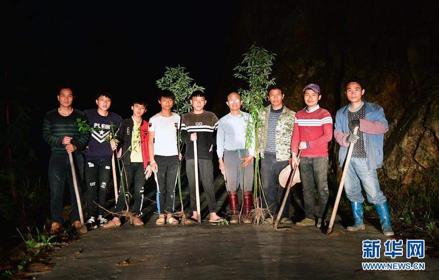 在乌英苗寨,广西籍党员梁安合(右四)、梁成兵(右三)和村民在种完景观树后合影(4月12日摄)。 乌英苗寨位于黔桂交界的大苗山深处,共有140户600多人。其中100户属广西柳州市融水苗族自治县杆洞乡党鸠村,40户属贵州省从江县翠里瑶族壮族乡南岑村。由于地处偏远,山多地少,脱贫攻坚任务艰巨,目前整个苗寨还有59户贫困户。 面对经济发展落后、贫困面广且程度深的现状,为加强基层党组织的领导核心作用,2017年6月,广西融水苗族自治县杆洞乡党委和贵州省从江县翠里瑶族壮族乡党委针对乌英“一寨跨两省区”的特点,积极探索党建新模式,组建成立“中国共产党桂黔两省(区)乌英屯联合支部委员会”。目前,联合党支部共有党员13名,其中广西籍9名,贵州籍4名。 乌英苗寨联合党支部的建立,使基层党组织的作用突破了行政区域的局限。改善基础设施和环境卫生、成立水果种植合作社、探索发展旅游产业、调解邻里纠纷、组织文体活动……两年来,联合党支部在乌英苗寨的各项工作中积极发挥引领作用,带领群众稳步走在脱贫致富的道路上。 新华社记者 黄孝邦 摄
