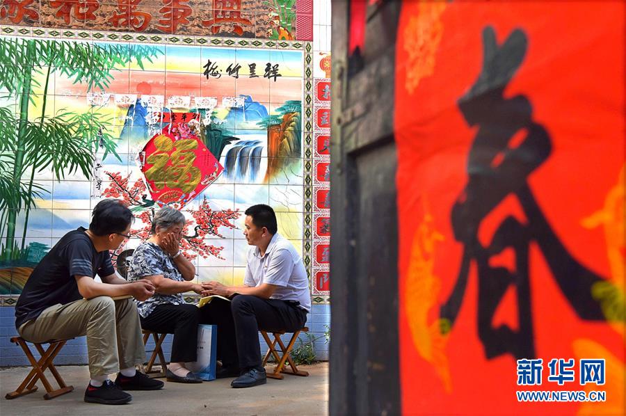 6月24日,驻村扶贫工作队员(左)与村干部(右)在一名“山里大妈”家中走访。 新华社发(赵东山 摄)