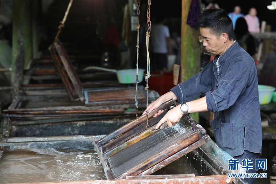 7月1日,在贵州省丹寨县南皋乡石桥村,工匠在通过“抄纸”工序制作手工皮纸。 贵州省丹寨县石桥村是首批国家级非物质文化遗产“皮纸制作技艺”的传承地之一。近年来,造纸技艺传承人弘扬传统工艺,将古法造纸加以文创设计,产品畅销国内外市场,民族传统工艺也成为旅游观光的新热点。 新华社记者 欧东衢 摄