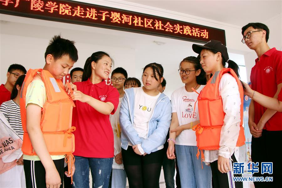 7月2日,扬州大学广陵学院大学生志愿者为宝应县子婴河社区留守儿童讲解救生衣的使用方法。 进入暑期,各地学生纷纷参加形式多样的社会实践活动,度过一个充实的假期。 新华社发(沈冬兵 摄)