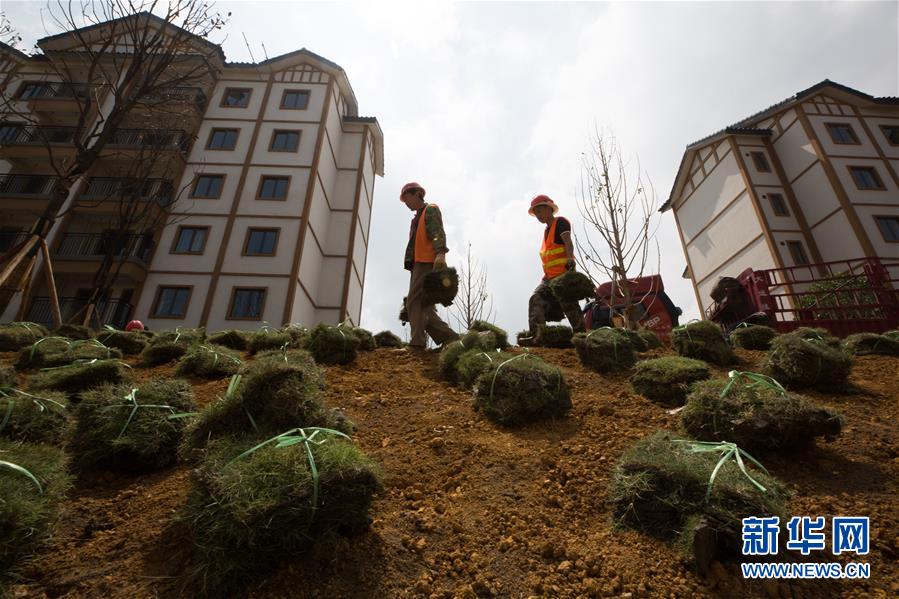 7月2日,工人在贵州省毕节市大方县奢香古镇第三期安置区里搬运准备铺设的草皮。 近日,位于贵州省毕节市大方县的易地扶贫搬迁集中安置区奢香古镇启动第三期搬迁安置工作,工人们抢抓工期尽快将安置区绿化工作完成,以迎接近千名安置群众搬入新家园。 新华社发(罗大富 摄)