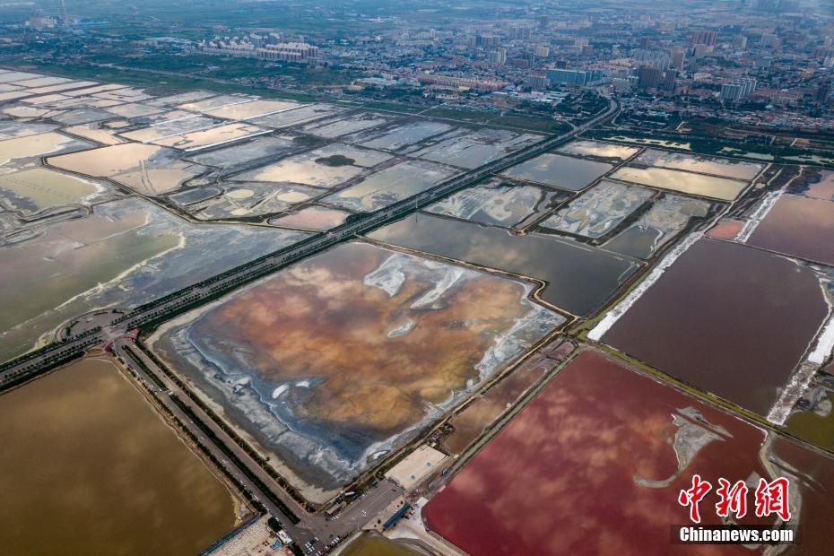 近日,运城市持续高温天气,运城盐湖的颜色随着水的浓度变化而变化,呈现出色彩斑斓的美景,成为夏日特有的一道风景。图为7月2日航拍山西运城盐湖。中新社记者 韦亮 摄