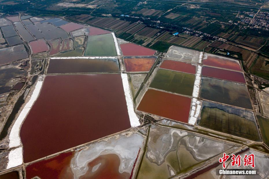 7月3日,山西省运城市,无人机航拍色彩斑斓的盐湖。入夏以来,随着气温不断攀升,位于山西省南部的运城盐湖浓度升高,呈现出色彩斑斓景观,从空中俯瞰犹如天然“调色盘”,成为当地夏日一道独特风景。中新社记者 韦亮 摄