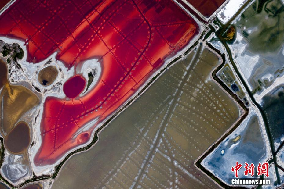 近日,运城市持续高温天气,运城盐湖的颜色随着水的浓度变化而变化,呈现出色彩斑斓的美景,成为夏日特有的一道风景。图为7月2日航拍山西运城盐湖。中新社记者 韦亮 摄