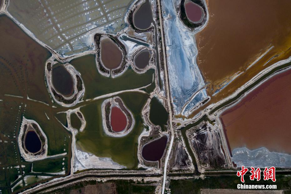 近日,运城市持续高温天气,运城盐湖的颜色随着水的浓度变化而变化,呈现出色彩斑斓的美景,成为夏日特有的一道风景。图为7月2日航拍山西运城盐湖。中新社记者 韦亮 摄