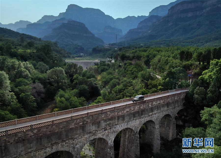 7月4日,车辆行驶在红旗渠桃园渡桥上(无人机拍摄)。桃园渡桥位于红旗渠第一干渠桃园村附近,横跨桃园河。此渡桥既是渡槽也是桥,同时不妨碍行洪,是红旗渠工程的一个创举。 新华社记者 李安 摄