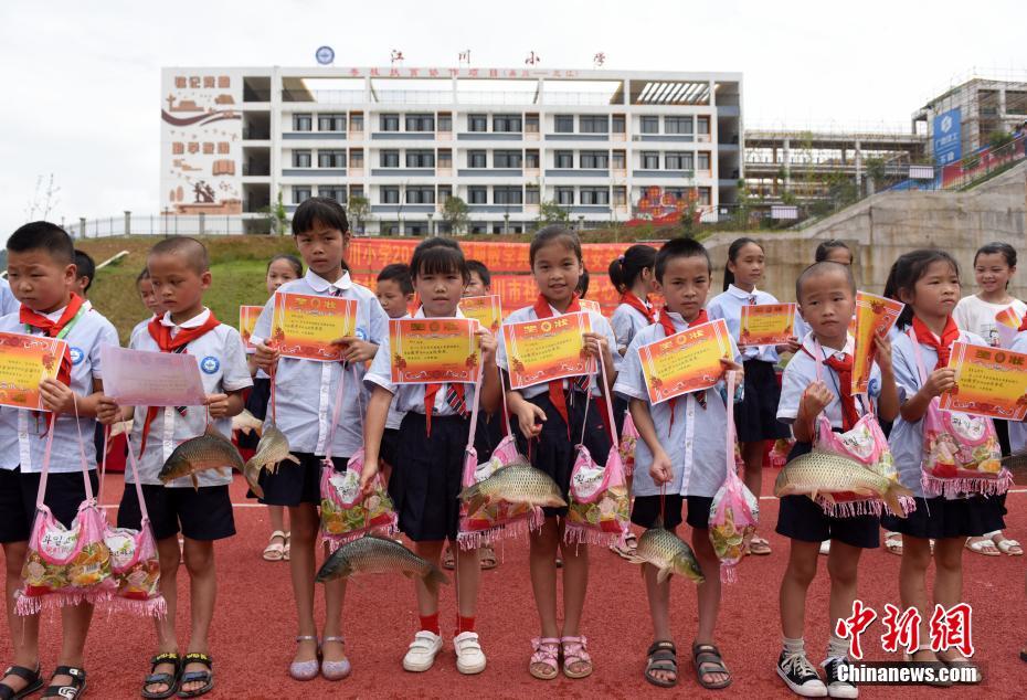 7月5日,广西柳州市三江侗族自治县古宜镇江川小学举行2019年春季学期散学典礼,向该校140余名在期末考试中获奖的学生,每人奖励一条2斤多重的活鲤鱼和一袋果冻,祝愿学生能鱼跃龙门。中新社发 龚普康 摄