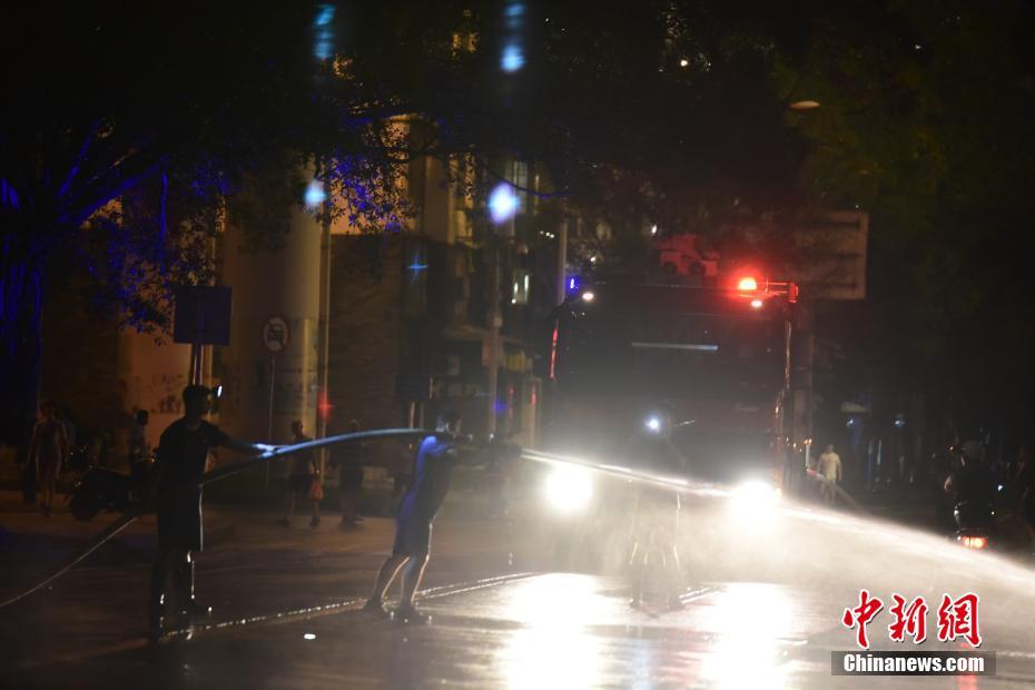 7月8日,洪水过境广西柳州市,10时00分出现洪峰水位82.41米,距警戒水位仅差9厘米,市区内多段道路被充满泥沙的洪水淹没。16时许,洪水逐渐退到道路以下后,百余名武警官兵和当地群众一起对道路上的淤泥进行清洗。直到23时许,道路上的淤泥才被冲刷完毕,清淤工作阶段性结束。图为消防员借助消防车水枪在清淤。王以照 摄