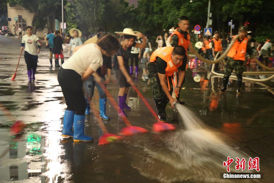 7月8日,洪水过境广西柳州市,10时00分出现洪峰水位82.41米,距警戒水位仅差9厘米,市区内多段道路被充满泥沙的洪水淹没。16时许,洪水逐渐退到道路以下后,百余名武警官兵和当地群众一起对道路上的淤泥进行清洗。直到23时许,道路上的淤泥才被冲刷完毕,清淤工作阶段性结束。图为武警官兵和市民一起对洪水退去后的路面进行清洗。王以照 摄