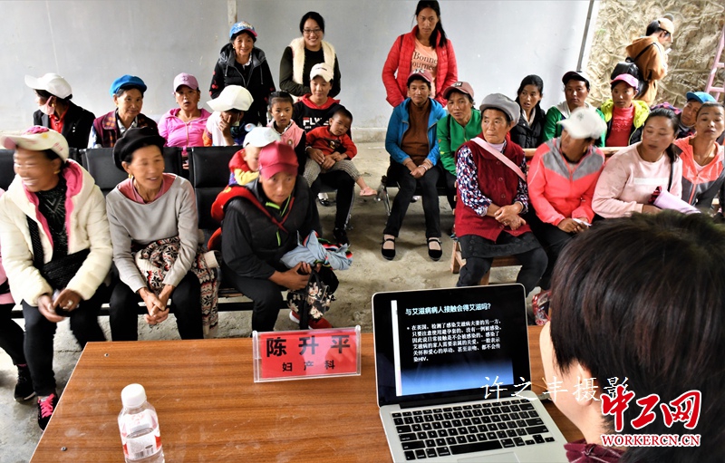 2019年7月9日,云南德钦县拖顶傈僳族乡卫生院,来自“同心·共铸中国心”2019迪庆行医疗专家,国家电网北京电力医院妇产科专家陈升平主任,为当地的百姓讲解医疗科普知识,日常生活妇女卫生保健,艾滋病的传播途径,预防的重要性等科普知识讲座。工人日报-中工网许之丰摄影报道