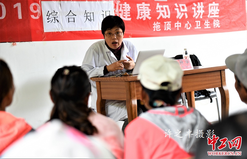 2019年7月9日,云南德钦县拖顶傈僳族乡卫生院,来自“同心·共铸中国心”2019迪庆行医疗专家,国家电网北京电力医院妇产科专家陈升平主任,为当地的百姓讲解医疗科普知识,日常生活妇女卫生保健,艾滋病的传播途径,预防的重要性等科普知识讲座。工人日报-中工网许之丰摄影报道