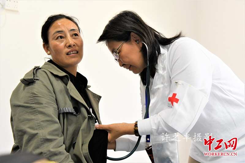 2019年7月9日,“同心·共铸中国心”2019迪庆行医疗专家志愿者59人,来到云南德钦县拖顶傈僳族乡,这里位于滇西北独有的“三江”(怒江、澜沧江、金沙江)并流地段,由西向东流入金沙江,山区、河谷是本乡的地势特征,全乡共1879户,78个生产小组,共有人口9609人。医疗专家志愿者在乡卫生院,全天义诊1126人次;捐赠药品金额150239元;入户慰问两户;先心病筛查共普查儿童334名,其中3名先心病患儿。图为医疗专家在拖顶乡卫生院给百姓看病治病的情景。工人日报-中工网许之丰摄影报道