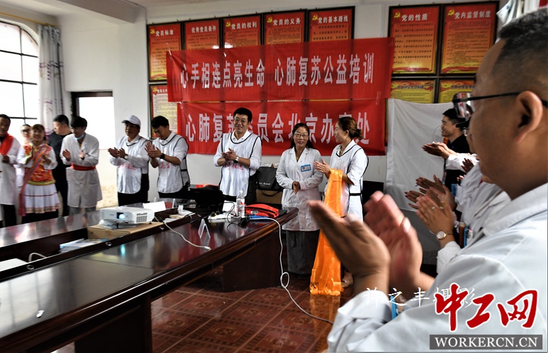 2019年7月9日,云南德钦县拖顶傈僳族乡卫生院,来自“同心·共铸中国心”2019迪庆行医疗专家,首都医科大学附属北京妇产医院怀柔妇幼保健院徐铭军院长率领的专业团队,为当地卫生院医务进行“心手相连 点亮生命”培训心肺复苏急救技术讲座,介绍心肺复苏急救技术的重要性和实操细节,耐心、细致的指导乡村医务人员,并捐赠模拟器和义务收徒弟代培心肺复苏急救的专业医疗技术。工人日报-中工网许之丰摄影报道
