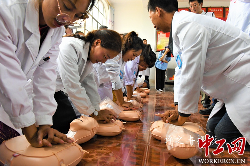 2019年7月9日,云南德钦县拖顶傈僳族乡卫生院,来自“同心·共铸中国心”2019迪庆行医疗专家,首都医科大学附属北京妇产医院怀柔妇幼保健院徐铭军院长率领的专业团队,为当地卫生院医务进行“心手相连 点亮生命”培训心肺复苏急救技术讲座,介绍心肺复苏急救技术的重要性和实操细节,耐心、细致的指导乡村医务人员,并捐赠模拟器和义务收徒弟代培心肺复苏急救的专业医疗技术。工人日报-中工网许之丰摄影报道