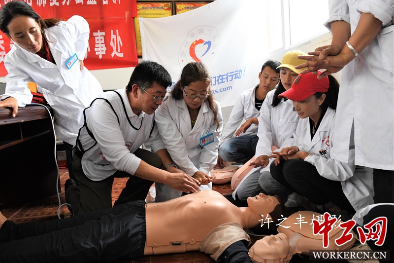 2019年7月9日,云南德钦县拖顶傈僳族乡卫生院,来自“同心·共铸中国心”2019迪庆行医疗专家,首都医科大学附属北京妇产医院怀柔妇幼保健院徐铭军院长率领的专业团队,为当地卫生院医务进行“心手相连 点亮生命”培训心肺复苏急救技术讲座,介绍心肺复苏急救技术的重要性和实操细节,耐心、细致的指导乡村医务人员,并捐赠模拟器和义务收徒弟代培心肺复苏急救的专业医疗技术。工人日报-中工网许之丰摄影报道