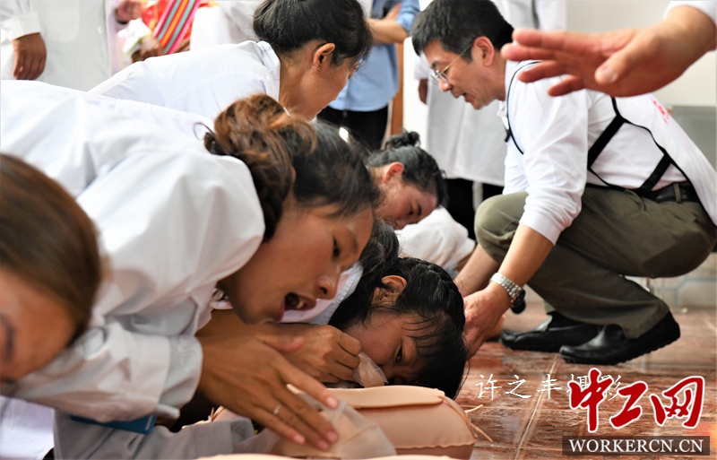 2019年7月9日,云南德钦县拖顶傈僳族乡卫生院,来自“同心·共铸中国心”2019迪庆行医疗专家,首都医科大学附属北京妇产医院怀柔妇幼保健院徐铭军院长率领的专业团队,为当地卫生院医务进行“心手相连 点亮生命”培训心肺复苏急救技术讲座,介绍心肺复苏急救技术的重要性和实操细节,耐心、细致的指导乡村医务人员,并捐赠模拟器和义务收徒弟代培心肺复苏急救的专业医疗技术。工人日报-中工网许之丰摄影报道