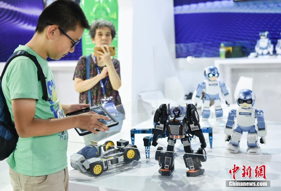 图为小朋友体验机器人展品。 中新网记者 翟璐 摄