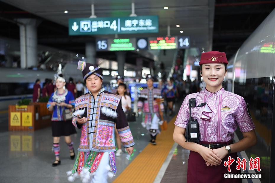 7月10日,广西南宁首开至香港直通动车。此次开行的动车车次为G417次,运行最高速度可达380公里每小时。图为动姐身着“铜鼓纹饰”制服亮相。中新社记者 俞靖 摄