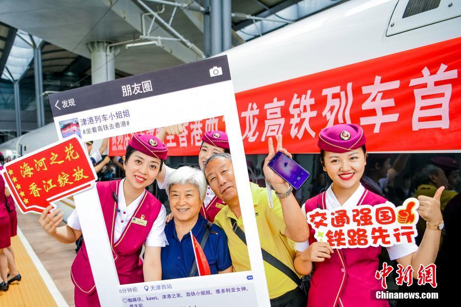 7月10日,天津西站,旅客与G305高铁列车乘务员在站台上合影。当日,天津至香港G305高铁列车开通运营,该线路天津西站始发,终点到香港西九龙,运行时间约10个小时,是天津地区首趟开往香港的高铁列车。中新社记者 佟郁 摄