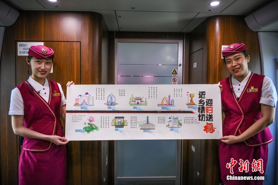 7月10日,天津至香港G305高铁列车开通运营,该线路天津西站始发,终点到香港西九龙,运行时间约10个小时,是天津地区首趟开往香港的高铁列车。图为乘务员展示乘务组制作的沿线景点手绘画。中新社记者 佟郁 摄