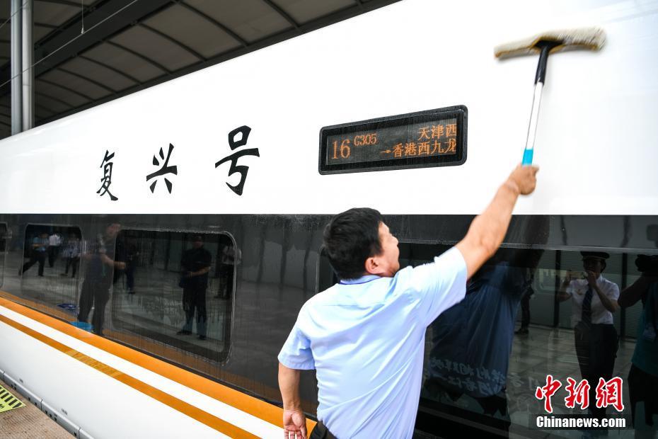 7月10日,天津至香港G305高铁列车开通运营,该线路天津西站始发,终点到香港西九龙,运行时间约10个小时,是天津地区首趟开往香港的高铁列车。图为工作人员正在清洁G305高铁列车。中新社记者 佟郁 摄