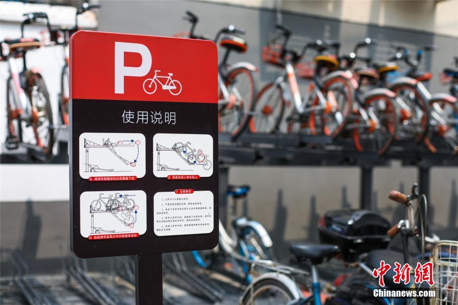 现场竖立的使用说明显示,如要将共享单车放入该立体停车器,需将单个停车架整体拉出后垂直下压、将单车放入停车架上,抬起停车架至水平并前推至底部即可完成停车。张为涛 摄