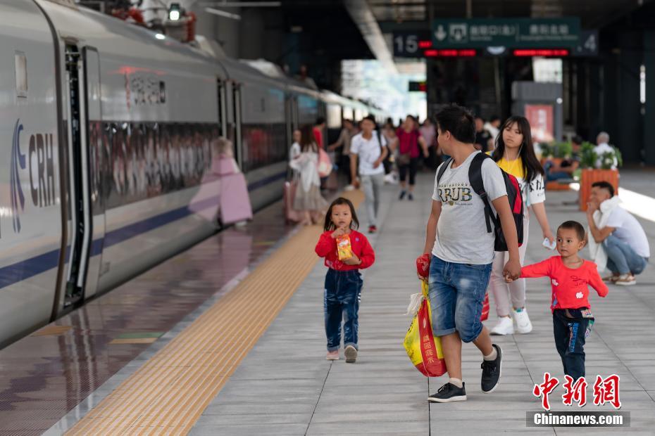7月10日,贵阳北站,站台上的乘客准备搭乘开往广州南的D2831次列车。中国国家铁路集团有限公司披露,10日零时起,全国铁路实施新的列车运行图,新投用一批复兴号动车组,内地联通香港的高铁车站增至58个,南宁至广州、南宁至昆明和兰新高铁哈密至乌鲁木齐等区段运行时间大幅压缩。调图后,全国铁路暑期高峰日均增加客运能力26万个席位。中新社记者 贺俊怡 摄