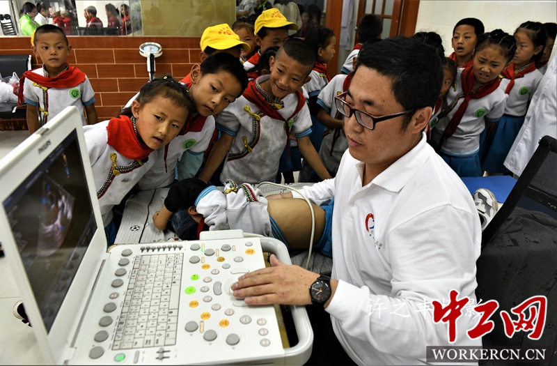 2019年7月10日,云南省徳钦县奔子栏镇,“同心·共铸中国心”2019迪庆行医疗专家,在超声科专家朱双利主任和小儿心脏外科专家李睿主任率领的团队,走进山区学校德钦县第二小学,进行小儿先天性心脏病筛查,对295名儿童筛查,共确诊2名的先心病儿童信息。先天性心脏病是胎儿时期心脏血管发育异常所致的心血管畸形,是小儿最常见的心脏病。图为医疗专家在德钦县第二小学筛查先心病。工人日报-中工网许之丰摄影报道