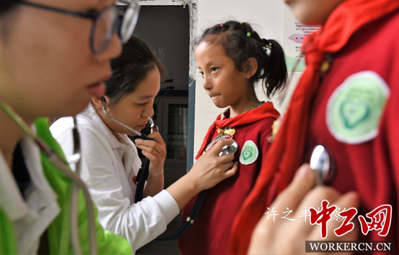 2019年7月10日,云南省徳钦县奔子栏镇,“同心·共铸中国心”2019迪庆行医疗专家,在超声科专家朱双利主任和小儿心脏外科专家李睿主任率领的团队,走进山区学校德钦县第二小学,进行小儿先天性心脏病筛查,对295名儿童筛查,共确诊2名的先心病儿童信息。先天性心脏病是胎儿时期心脏血管发育异常所致的心血管畸形,是小儿最常见的心脏病。图为医疗专家在德钦县第二小学筛查先心病。工人日报-中工网许之丰摄影报道