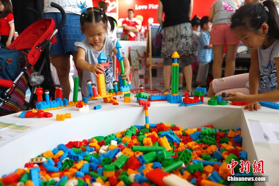 7月11日,第10届中国玩博会·北京站在全国农业展览馆开幕。今年有来自全球30余个国家和地区的210多个玩具品牌参展,涵盖拼插积木、拆箱盲盒、IP授权、科技智能、创意DIY、木制毛绒等各类产品。展会将持续至14日。图为拼插玩具吸引小朋友。中新社记者 富田 摄