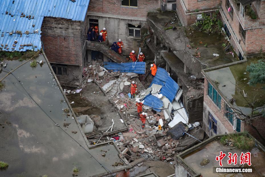 7月11日5时许,贵州省贵阳市云岩区黔灵镇万江小区长冲二组,一栋三层楼的村民自建房发生垮塌,经初步核查7人被困。目前已救出2人,并送医院进行救治,其中1人轻伤。目前救援工作正有序进行,事故原因正在调查中。图为消防队员在现场进行搜救。中新社记者 贺俊怡 摄