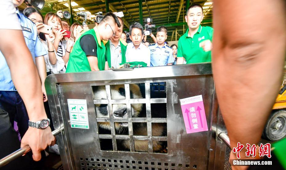 7月11日,来自中国大熊猫保护研究中心的大熊猫姐妹花“春俏”和“胖妞”经过一路长途跋涉顺利抵达武汉动物园。预计经过7天适应期后,武汉市民便可一睹“两姐妹”的“芳容”。图为武汉动物园的工作人员将大熊猫运往熊猫馆。中新社记者 张畅 摄