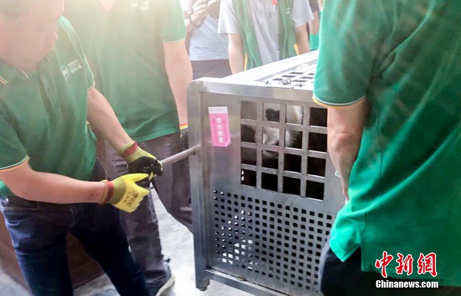 7月11日,来自中国大熊猫保护研究中心的大熊猫姐妹花“春俏”和“胖妞”经过一路长途跋涉顺利抵达武汉动物园。预计经过7天适应期后,武汉市民便可一睹“两姐妹”的“芳容”。图为武汉动物园的工作人员将大熊猫运往熊猫馆。中新社记者 张畅 摄