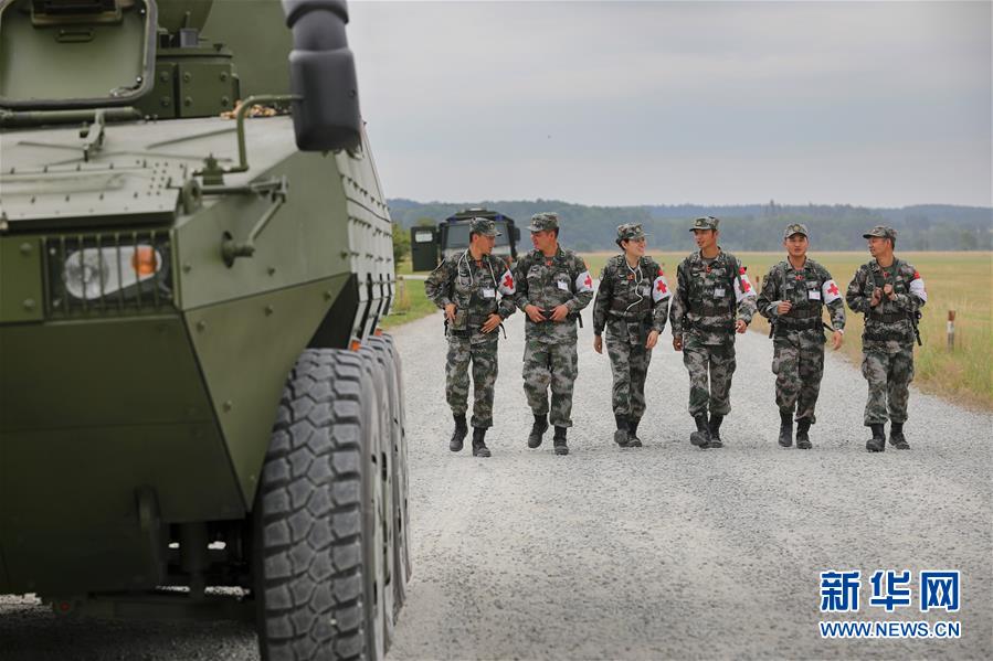 7月11日,在德国费尔德基兴卫勤训练基地,我军首次走出国门参加中外卫勤联合演习的6名卫生士官走在训练场上。 德国,施特劳宾,费尔德基兴卫勤训练基地,中德“联合救援-2019”卫勤实兵联合演习在此火热举行。 连日来,围绕共同提高应急医学救援能力、协同合作能力,进一步深化两军了解互信的目标,双方派出各领域精兵强将,在联合指挥控制、联合伤员救治、联合疫情防控和联合伤员后送演习中,呈现出一幕幕精彩表现。 新华社记者 琚振华 摄