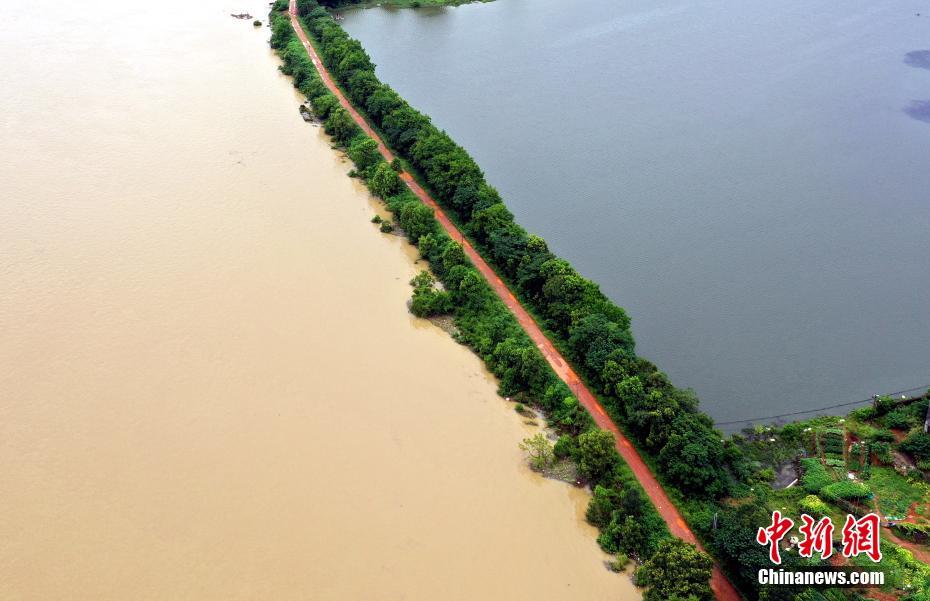 7月12日,江西赣江、抚河洪水持续汇入下游南昌青岚湖、金溪湖等湖泊,浑浊的水流直入鄱阳湖。受持续强降雨影响,江西多地河流发生超警洪水,部分地区发生险情。7月12日17时,鄱阳湖星子站水位19.92米,超警戒线0.92米。受上游持续来水影响,目前鄱阳湖水位仍在上涨。图为航拍洪水流经南昌县泾口乡金溪湖,洪水与相邻湖泊清水对比“泾渭分明”。王昊阳 摄